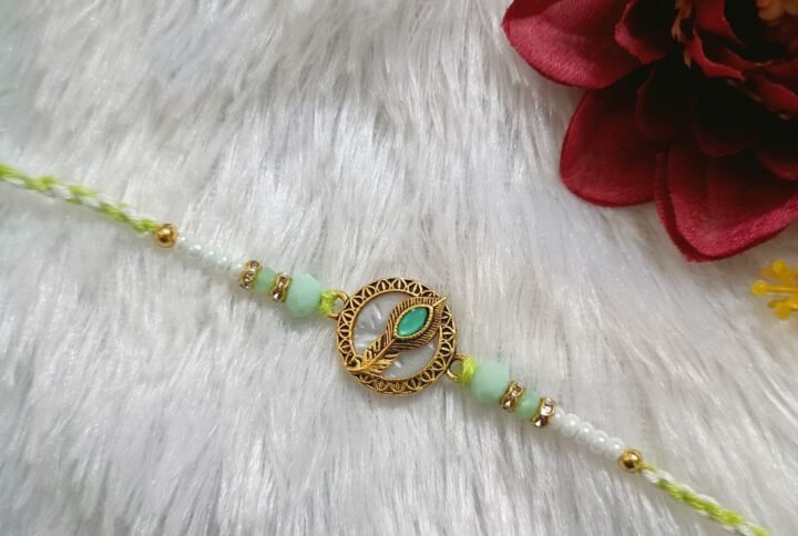 – A classic braided blue rakhi featuring soft beads and a striking evil eye charm for protection and good vibes.